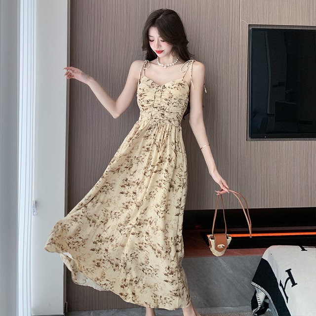 レディース ワンピース キャミワンピ ロング ノースリーブ フレア Aライン 背中開き フェミニン リボン ハイウエスト かわいい 大人可愛い きれいめ カジュアル おしゃれ こなれ感 ラフ ガーリー 主役級 存在感 抜け感 ロマンティック ナチュラル 花柄 フラワー 夏 デート お出かけ イベント リゾート 旅行 海 プール レストラン ビーチ 女子会 休日 バカンス ホテル ショッピング カフェ 韓国 オルチャン コーデ 体型カバー 脚長 普段使い 着回し モテ S M L アプリコット