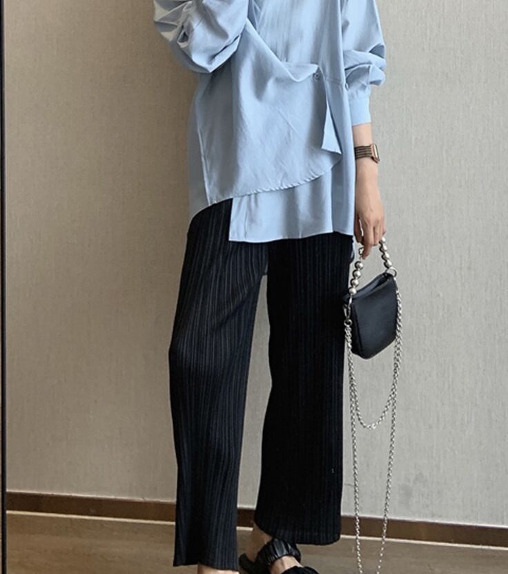 パンツの中でも、スッキリと美脚効果が高い、ハイウエスト&ロング丈のストレートパンツ。