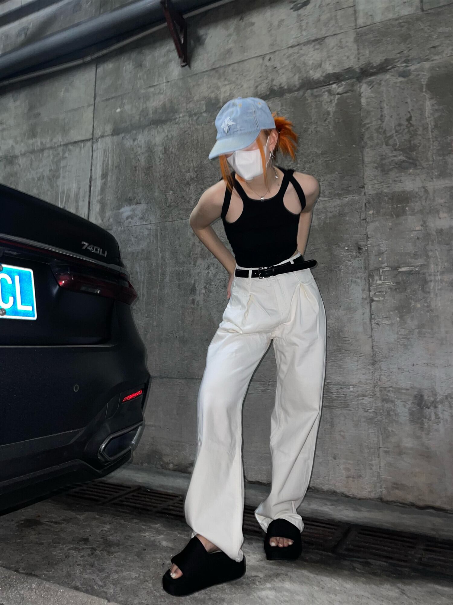 高めのウエストで、脚長効果も抜群なホワイトのジーンズ。