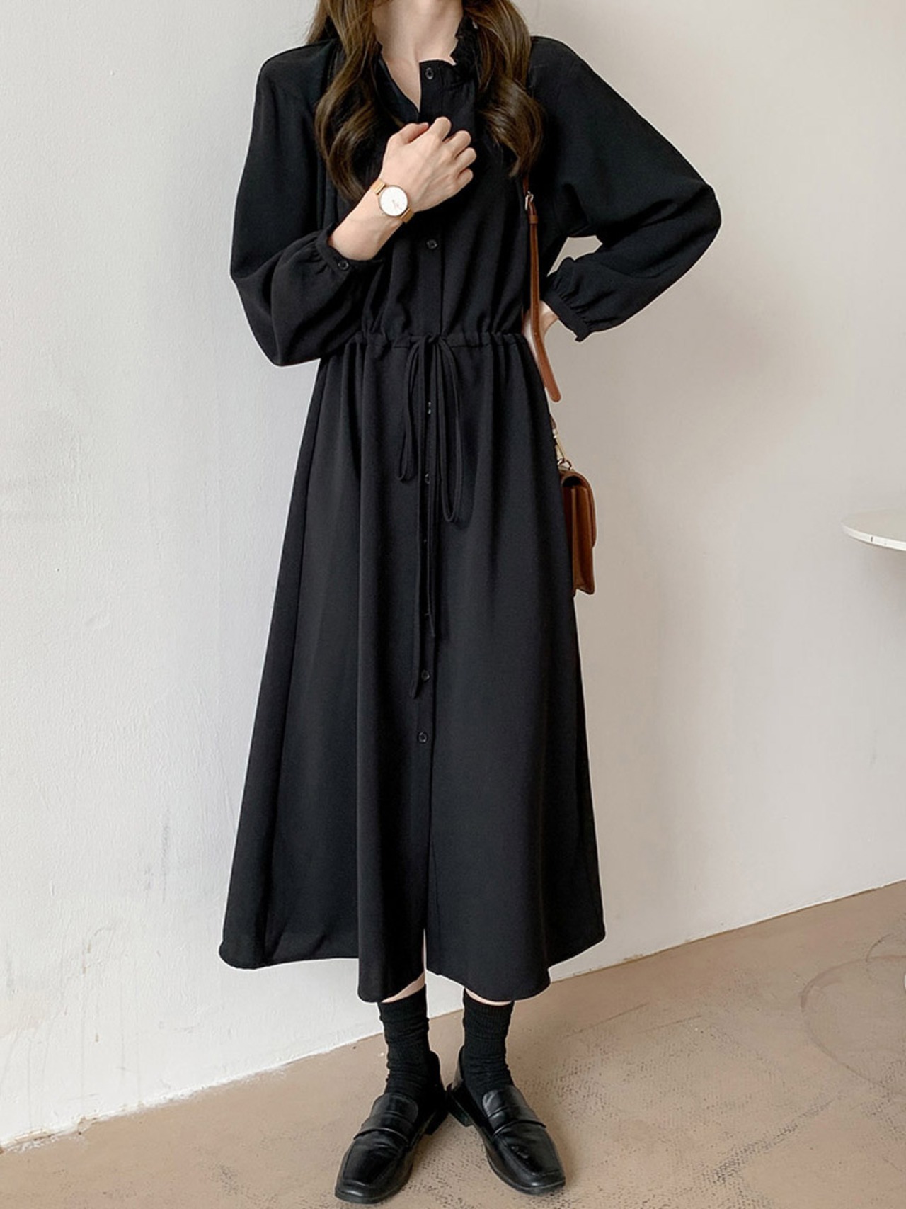 ワンピース シャツワンピース ミモレ丈 ロング丈 長袖ドロップショルダー 襟なし セミフレア ワイド Aライン スリット ウエストマーク 前開き かわいい 大人可愛い カジュアル おしゃれ お洒落 大人女子 こなれ感 ラフ ルーズ 主役級 存在感 抜け感 無地 夏 10代 20代 30代 40代 50代 60代 レディース 女性用 デート お出かけ 女子会 休日 リゾート 旅行 着回し 普段使い 韓国系 オルチャン ファッション コーデ スタイル 体系カバー XS S M L XL ブラック