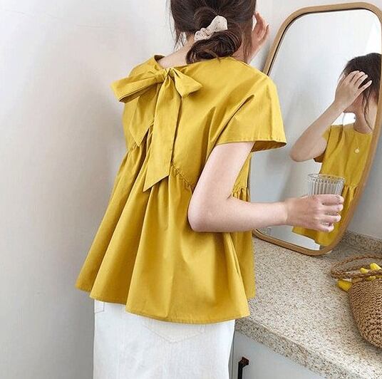トップス シャツ 白シャツ ミディアム丈 袖あり 半袖 ラウンドネック 襟なし 切り替えデザイン リボン バックリボン 薄手 かわいい 大人可愛い きれいめ シンプル 上品 おしゃれ アジアン エスニック エキゾチック ラブリー キュート フォーマル 無地 夏 秋 20代 30代 レディース 女性用 通勤 デート お出かけ 公園デビュー 女子会 休日 イベント リゾート 旅行 海 ホテル ガーデン レストラン 着回し 普段使い モテ サイズ S M L XL 2XL 色展開 白 ホワイト 黄色 イエロー