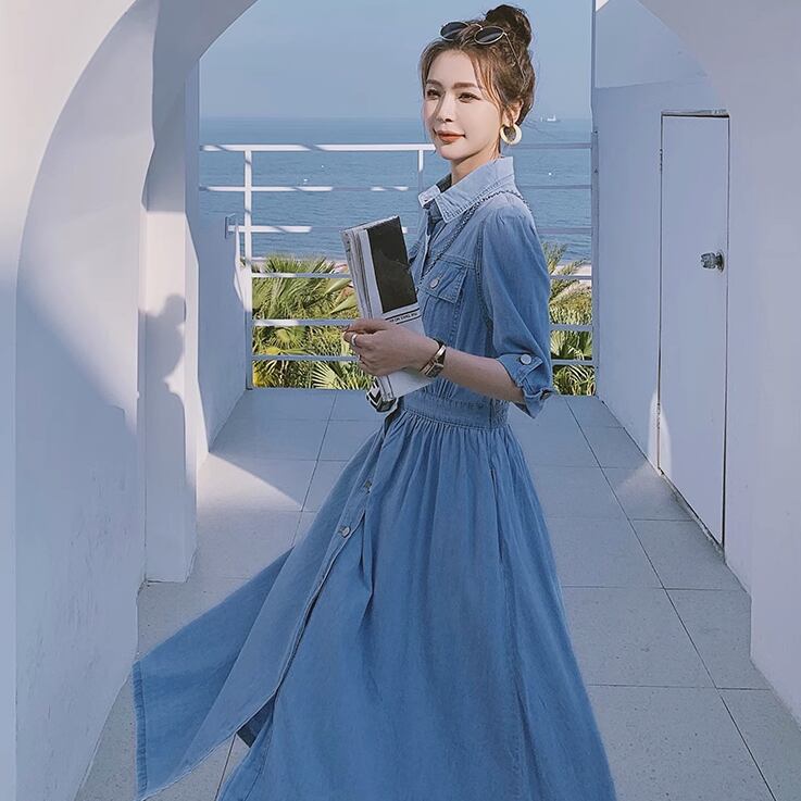 ワンピース フレアワンピース デニムワンピース マキシ丈 袖あり 半袖 5分袖 襟付き スタンドカラー フレア Aライン ウエストマーク ポケット ハイウエスト 前開き ウエストゴム デニム かわいい 大人可愛い シンプル カジュアル 大人 おしゃれ レトロ 大人女子 こなれ感 ラフ キュート モダン 存在感 抜け感 無地 夏 10代 20代 30代 40代 レディース 女性用 ママ OL 学生 通学 お出かけ 公園デビュー 女子会 休日 リゾート 旅行 高原 脚長 XS S M L XL 2XL