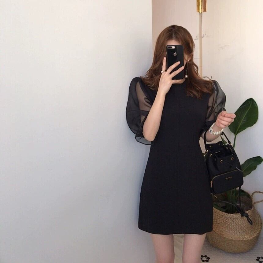 ワンピース ワンピドレス ショート丈 膝上 半袖 パフスリーブ ラウンドネック スリム タイト 切り替えデザイン ドッキング シフォン ファスナー 透け感 シースルー 薄手 異素材MIX かわいい 大人可愛い シンプル 大人 上品 おしゃれ お洒落 エキゾチック 大人可愛い 大人女子 こなれ感 キュート ガーリー エレガント 主役級 存在感 とろみ感 抜け感 無地 夏 結婚式 二次会 10代 20代 30代 レディース 女性用 パーティー イベント レストラン 着回し 普段使い モテ S M L ブラック