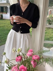 Vネックとパフスリーブが特徴的な可愛らしいカーディガン。