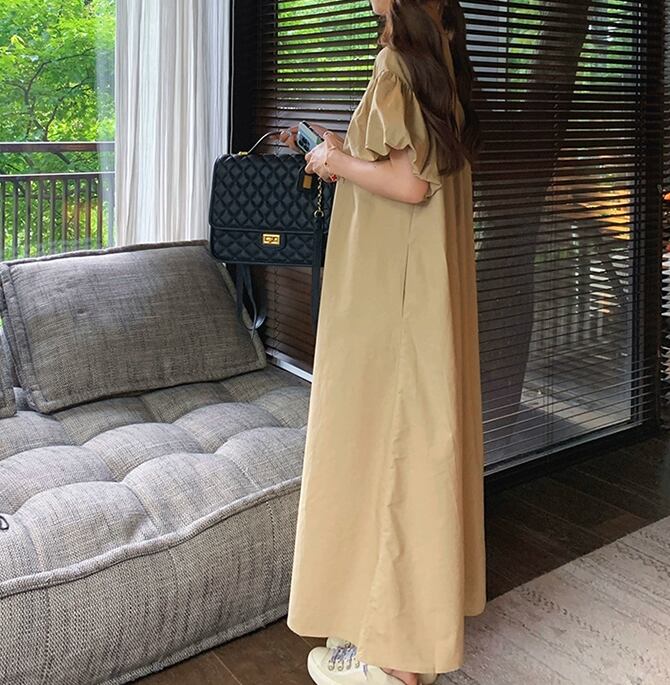 フレアワンピース バルーンスリーブ ロング丈 ふんわり 半袖 Uネック 細身 ストレート スマート シフォン 前開き 伸縮性 大人可愛い きれいめ シンプル カジュアル おしゃれ 大人女子 こなれ感 ラフ ルーズ モダン とろみ感 抜け感 無地 春 夏 秋 10代 20代 レディース ママ デート お出かけ 公園デビュー 休日 リゾート 旅行 海 レストラン ショッピング 普段使い 楽ちん モテ 体系カバー 二の腕カバー トレンド S M L XL ゆったり ゆる ベージュ 大人カラー