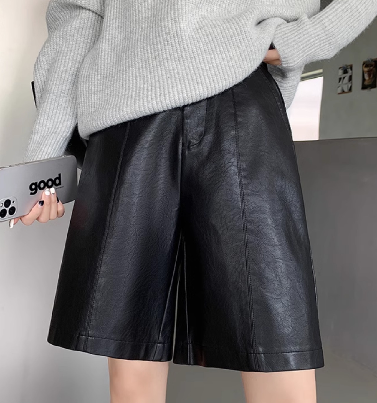 ミディアム丈のレザーショートパンツ。