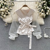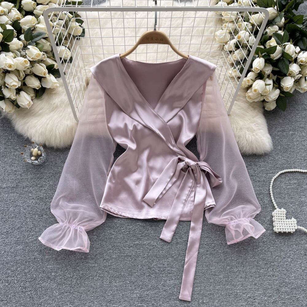 トップス デート モテアイテム シャツ 長袖 シフォン 大人可愛い きれいめ 上品 Vネック リボン おしゃれ かっこいい 大人可愛い ラブリー キュート ガーリー クール モード系 セクシー エレガント 存在感 フォーマル レディース 学生 通学 デート お出かけ 公園デビュー 女子会 お泊まり 休日 運動 ショッピング 普段使い 双子 韓国系 オルチャン ファッション コーデ スタイル 美脚 脚長 トレンド 流行 インスタ映え フリーサイズ カーキ パープル ブラック ホワイト