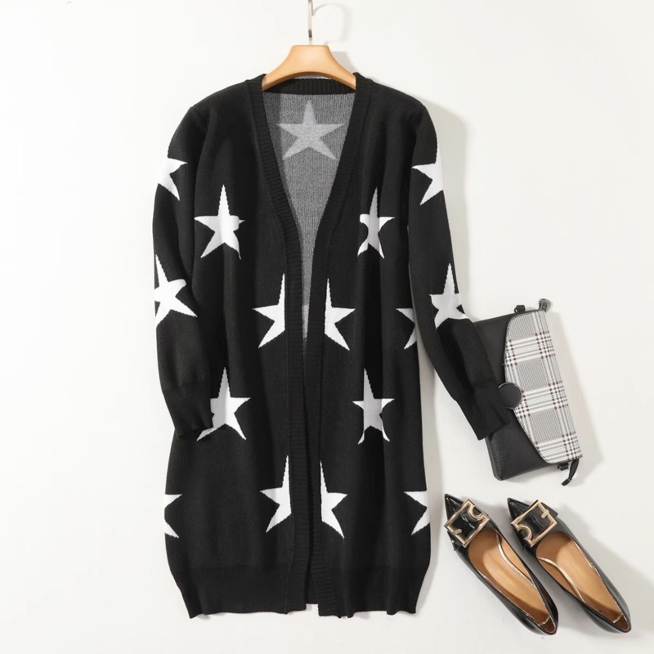 パッと目を引くスター柄のニットカーディガンです。