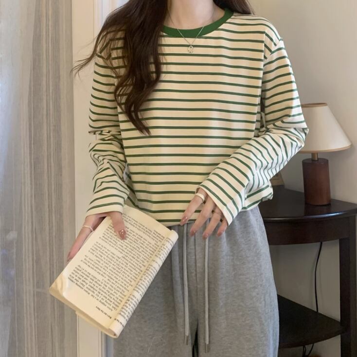 トップス プルオーバー ロングTシャツ 袖あり 長袖 萌袖 ラウンドネック 襟なし 綿 大人可愛い きれいめ カジュアル 大人 おしゃれ かっこいい レトロ 大人女子 こなれ感 ラフ ボーイッシュ ラブリー キュート モダン 存在感 抜け感 ストライプ 春 10代 20代 30代 40代 レディース 女性用 ママ OL 学生 通学 デート お出かけ 公園デビュー 休日 アウトドア イベント 旅行 着回し 普段使い オルチャン ファッション 楽ちん 定番 S M L XL ブラック グリーン カーキ