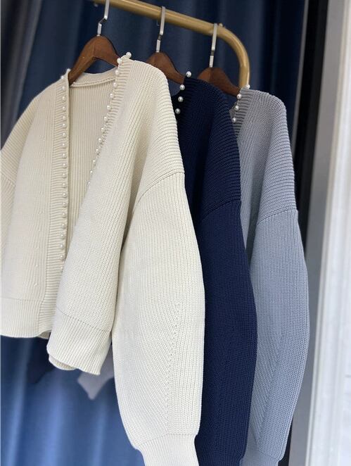 トップス カーディガン 白トップス ショート丈 袖あり 長袖 ボリューム袖 ドロップショルダー パール 襟なし ワイド 前開き リブニット ニット 大人可愛い シンプル カジュアル おしゃれ お洒落 大人女子 こなれ感 ラフ ガーリー ルーズ 主役級 存在感 抜け感 無地 春 秋 10代 20代 30代 40代 レディース 女性用 デート お出かけ 女子会 休日 着回し 普段使い 重ね着 韓国系 オルチャン ファッション コーデ スタイル 体系カバー S M グレー ライトベージュ ネイビー