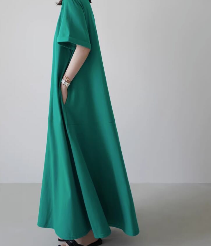 ワンピース フレアワンピース ワンピドレス ロング ロング丈 袖あり 半袖 ラウンドネック 襟なし セミフレア Aライン ポケット 綿 かわいい 大人可愛い シンプル カジュアル 大人 おしゃれ お洒落 アジアン エスニック エキゾチック ラフ 無地 夏 秋 20代 30代 レディース 女性用 デート お出かけ 公園デビュー 女子会 休日 リゾート 旅行 海 ガーデン レストラン 普段使い 楽ちん モテ 脚長 サイズ S M L XL 色展開 緑 グリーン ピンク カラバリ