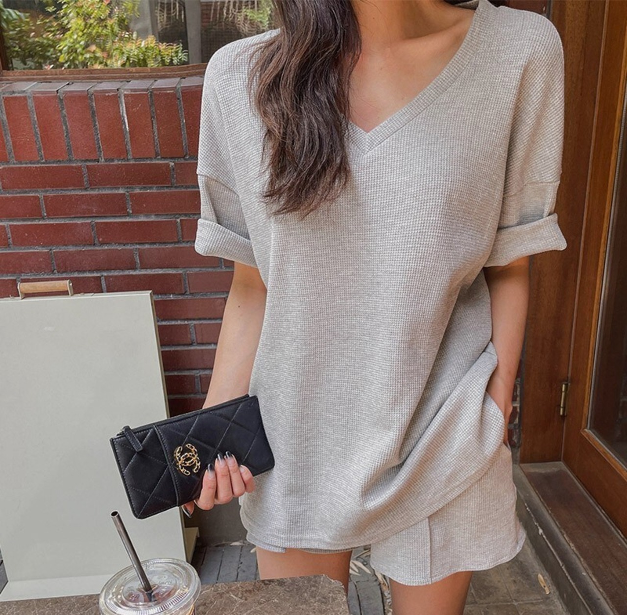 Tシャツ ショートパンツ 2点セット トップス 半袖 Vネック ショート丈 ルーズ 薄手 かわいい 大人可愛い きれいめ シンプル カジュアル 大人 上品 おしゃれ お洒落 かっこいい レトロ 大人女子 こなれ感 ラフ ラブリー キュート 個性的 モード系 セクシー エレガント モダン 主役級 存在感 無地 春 夏 10代 20代 レディース 女性用 デート お出かけ 女子会 休日 アウトドア パーティー イベント ショッピング モテ 着回し 普段使い ファッション スタイル 楽ちん M グレー
