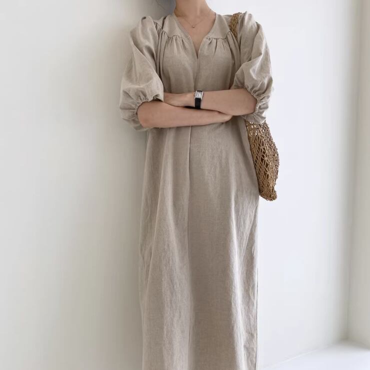 ワンピース ワンピドレス ロング ロング丈 袖あり 5分袖 五分袖 パフスリーブ Vネック 襟なし セミフレア Aライン ハイウエスト 綿 リネン かわいい 大人可愛い シンプル 大人 おしゃれ お洒落 レトロ アジアン エスニック 大人女子 ラフ 無地 夏 秋 20代 30代 レディース 女性用 通勤 デート お出かけ 公園デビュー 女子会 休日 リゾート 旅行 海 ガーデン レストラン 普段使い モテ 脚長 サイズ S M L XL 色展開 ブラック オフホワイト くすみカラー 大人カラー カラバリ