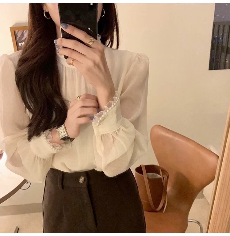 首元や袖のレースとパールがポイントになった長袖ブラウスです。