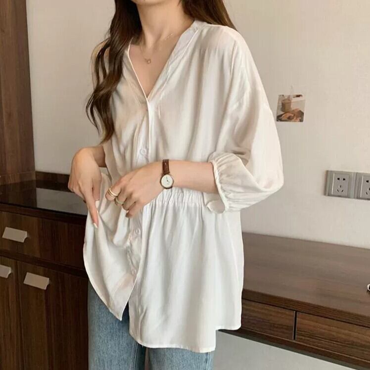 ウェストにギャザーが入り、スッキリとしたシルエットのVネックシャツです。