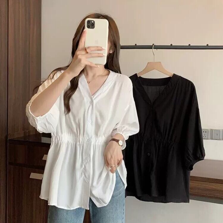 トップス シャツ 半袖 パフスリーブ ドロップショルダー Vネック 襟なし セミフレア ウエストマーク 前開き 薄手 かわいい 大人可愛い きれいめ シンプル 大人 上品 おしゃれ お洒落 大人可愛い 大人女子 こなれ感 ラブリー キュート ガーリー 存在感 とろみ感 抜け感 無地 春 夏 10代 20代 30代 40代 レディース 女性用 ママ 通勤 学生 デート お出かけ 女子会 休日 イベント 旅行 着回し 普段使い モテ M L XL 2XL 3XL 4XL ホワイト ブラック