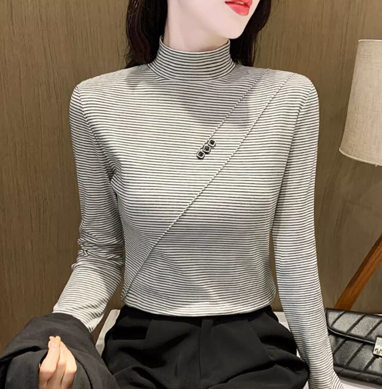 トップス カットソー プルオーバー 袖あり 長袖 ハイネック スリム 綿 ポリウレタン かわいい 大人可愛い きれいめ 大人 上品 おしゃれ 大人女子 こなれ感 キュート モダン 主役級 存在感 抜け感 ストライプ 秋 冬 誕生日 ハロウィン クリスマス 10代 20代 30代 40代 50代 60代 レディース 女性用 ママ OL 学生 通学 デート お出かけ 公園デビュー 休日 アウトドア イベント 旅行 着回し 普段使い オルチャン コーデ 定番 サイズ豊富 大きいサイズ 3色展開