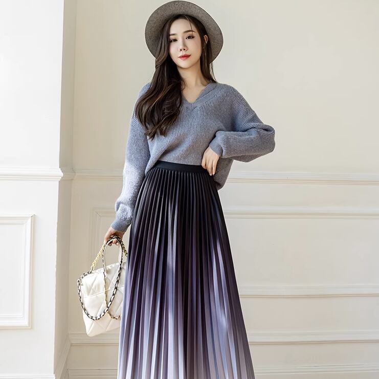スカート グラデーションスカート プリーツスカート ロング ロング丈 セミフレア Aライン プリーツ ハイウエスト ウエストゴム ポリエステル かわいい 大人可愛い きれいめ シンプル 大人 上品 おしゃれ お洒落 大人女子 キュート 存在感 無地 春 夏 秋 10代 20代 レディース 女性用 通勤 デート お出かけ 公園デビュー 女子会 休日 リゾート 旅行 海 ガーデン レストラン 着回し 普段使い モテ 脚長 サイズ S M L XL 色展開 青 ブルー 茶色 ブラウン 大人カラー カラバリ