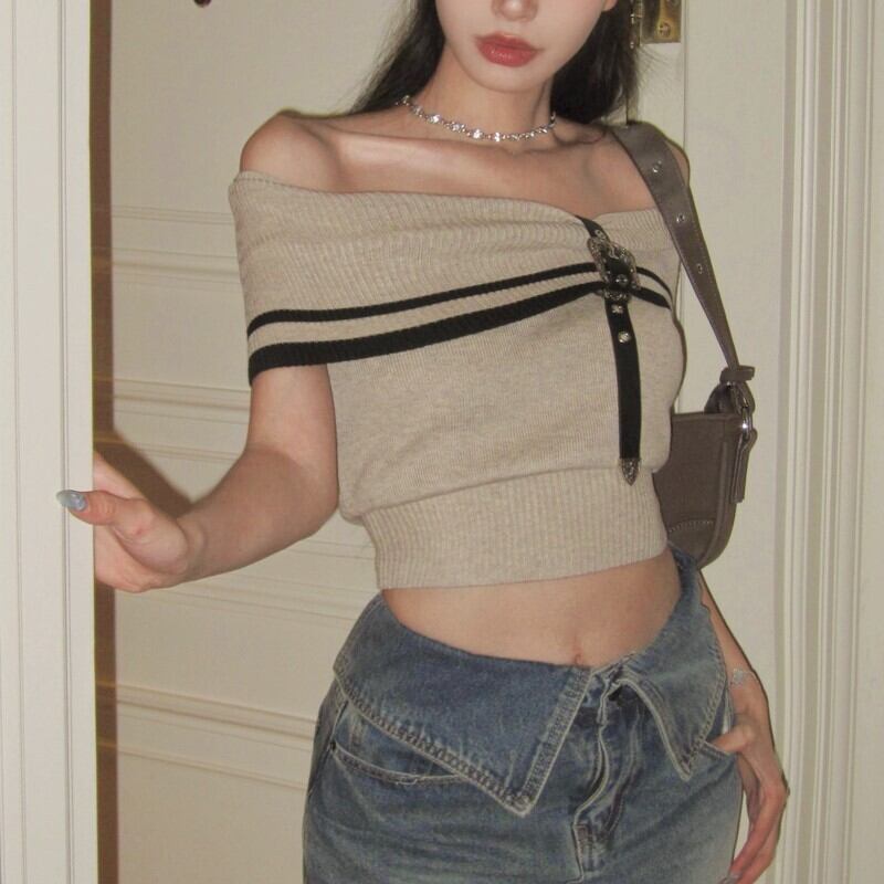 トップス ニット ワンショルダー オフショルダー ベルト 鎖骨 ショート かわいい 大人可愛い きれいめ シンプル カジュアル 大人 上品 おしゃれ お洒落 かっこいい レトロ 大人女子 こなれ感 ラフ ラブリー キュート ガーリー 個性的 モード系 セクシー エレガント モダン 主役級 存在感 無地 春 夏 10代 20代 30代 40代 レディース 女性用 デート お出かけ 女子会 休日 アウトドア パーティー イベント ショッピング モテ 着回し 普段使い ファッション ワンサイズ アプリコット