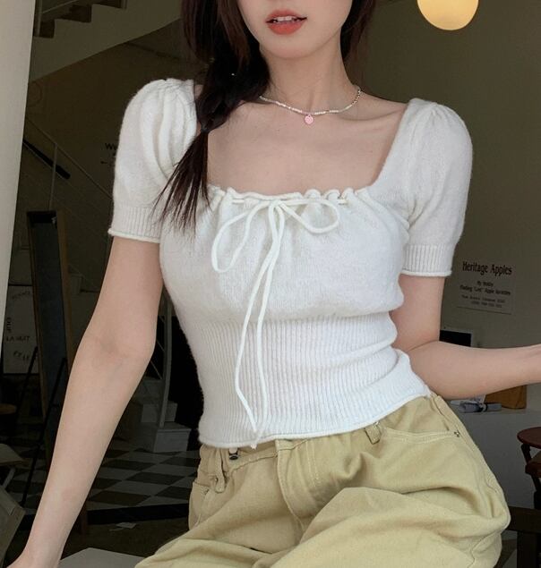 リブニット リボン スクエアネック サマーリブニット ウエストゴム トップス ニットソー ミニ丈 半袖 デコルテ ルーズ スリム タイト 細身 ストレート スマート ウエストマーク 伸縮性 サマーニット 薄手 かわいい 大人可愛い シンプル カジュアル 大人 おしゃれ 大人女子 こなれ感 ラフ ガーリー モード系 セクシー とろみ感 抜け感 無地 春 夏 10代 20代 レディース ママ デート お出かけ 公園デビュー 女子会 休日 運動 リゾート 旅行 海 プール 普段使い お揃い 楽ちん モテ 定番