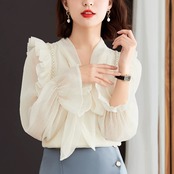 肩周りのフリルと袖口がふわりと大人可愛い長袖ブラウスです。