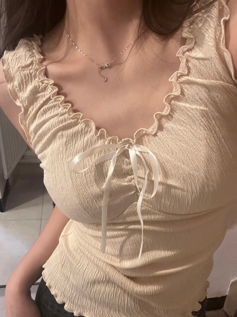ふんわりとしたリボンがポイントの甘くて可愛いノースリーブトップス。