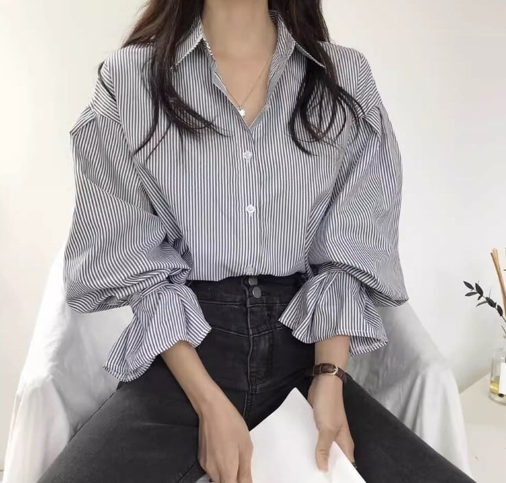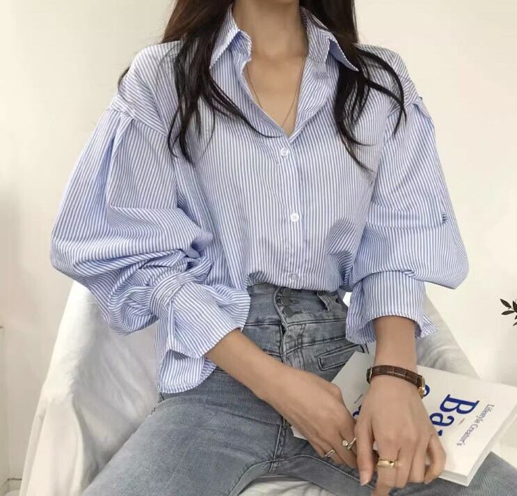 トップス シャツ 袖あり 長袖 ボリューム袖 ランタンスリーブ Vネック 襟付き レギュラーカラー フリル 前開き かわいい 大人可愛い カジュアル 上品 おしゃれ お洒落 かっこいい 大人女子 こなれ感 ラブリー キュート 個性的 クール エレガント モダン 主役級 存在感 抜け感 ストライプ 春 秋 10代 20代 30代 40代 レディース 女性用 ママ OL 通勤 学生 通学 デート お出かけ 休日 イベント 旅行 レストラン 着回し モテ トレンド インスタ映え フリーサイズ ブラック ブルー