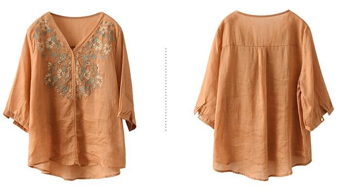 胸元にたっぷりと刺繍を施した七分袖Vネックプルオーバー。