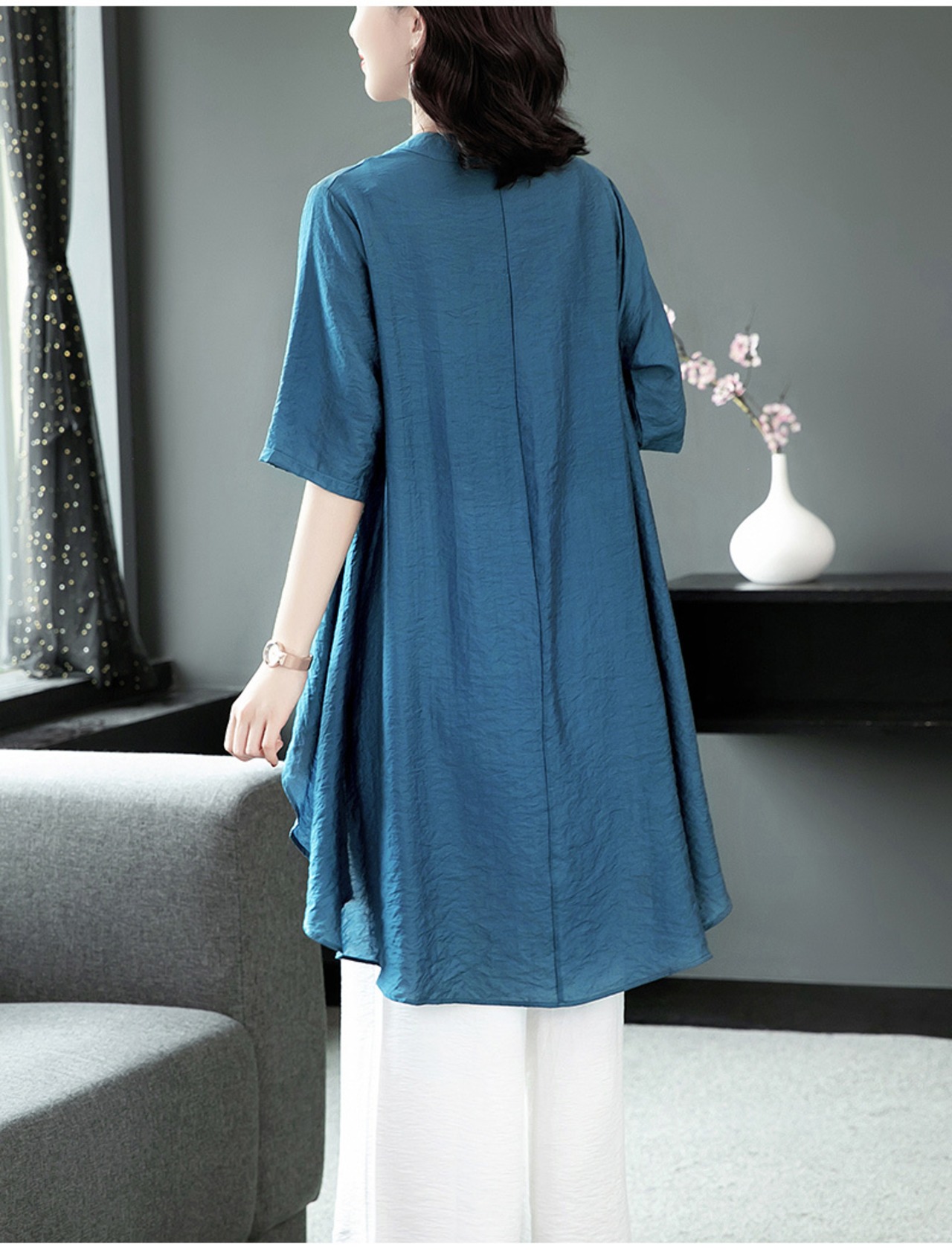 胸元の刺繍が華やかな五分袖シャツチュニックとパンツのセットアップ。