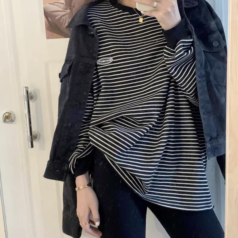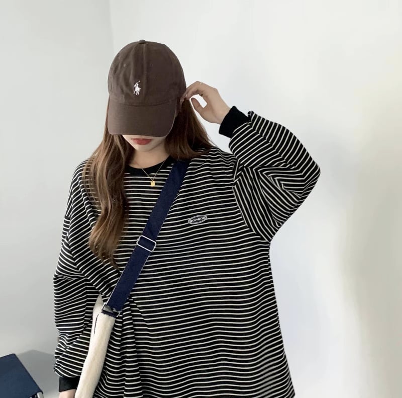 細めのボーダー柄がおしゃれな長袖トップスです。