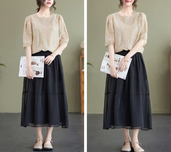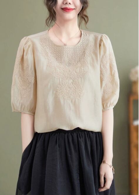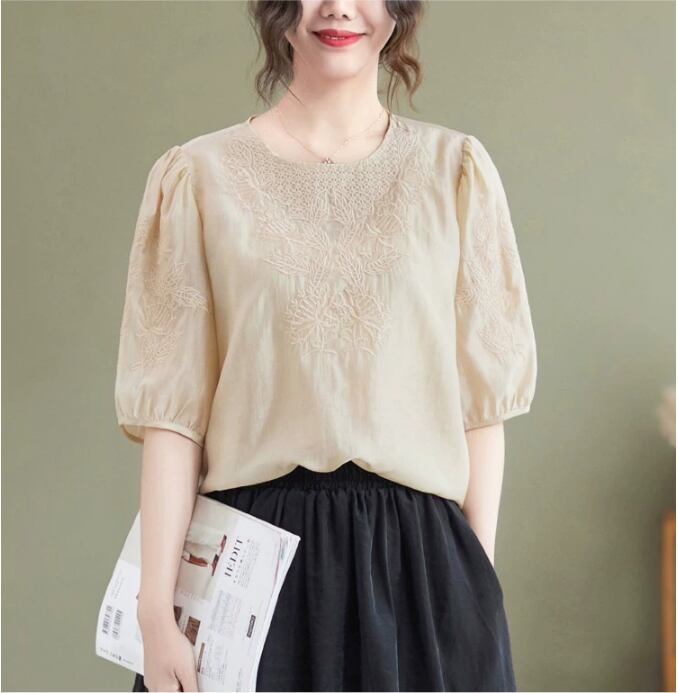 トップス ブラウス プルオーバー 白トップス 5分袖 五分袖 パフスリーブ クルーネック ワイド 刺繍 綿 コットン リネン コットンリネン 大人可愛い きれいめ シンプル カジュアル 上品 おしゃれ お洒落 大人女子 こなれ感 ラフ ガーリー ルーズ 存在感 フォーマル 抜け感 無地 柄 花柄 フラワー 夏 20代 30代 40代 50代 60代 レディース 女性用 デート お出かけ 女子会 休日 リゾート 旅行 着回し 普段使い 韓国系 オルチャン ファッション コーデ スタイル M L XL 2XL