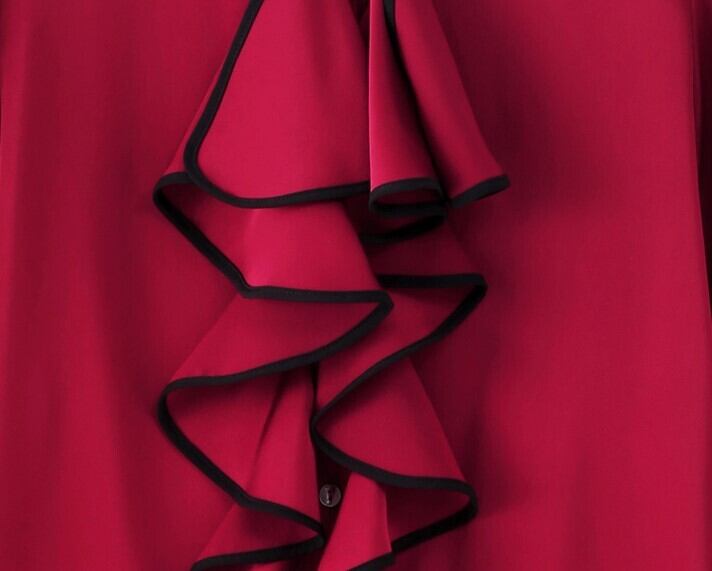配色パイピングとフリルが華やかな長袖ブラウス。