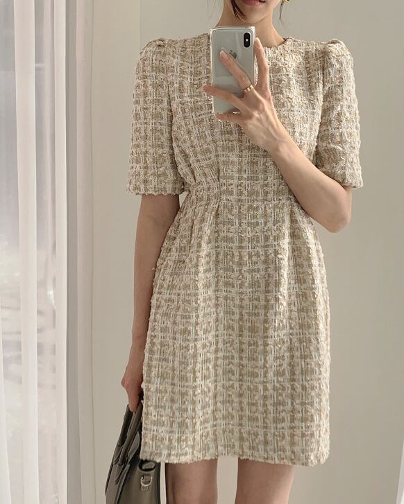 ワンピース ワンピドレス ショート ショート丈 膝上 袖あり 半袖 パフスリーブ ラウンドネック 襟なし ストレート Iライン ハイウエスト かわいい 大人可愛い きれいめ シンプル 大人 上品 おしゃれ お洒落 レトロ 大人女子 キュート 主役級 フォーマル 柄 格子柄 夏 秋 入学式 入園式 20代 30代 レディース 女性用 デート お出かけ 公園デビュー 女子会 休日 パーティー イベント 旅行 ガーデン レストラン モテ 脚長 サイズ S M 色展開 黒 ブラック オフホワイト カラバリ
