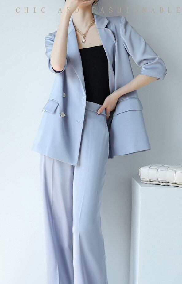 トレンド感のあるアンクル丈のパンツと袖ありの7分袖ブレザーがセットになっています。