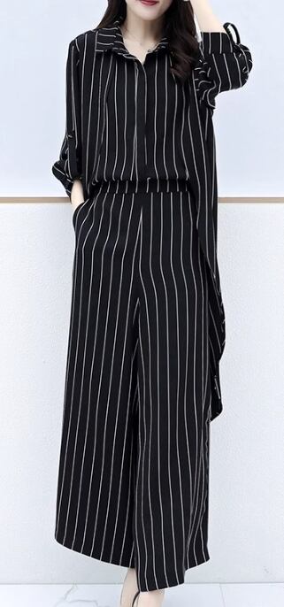 セットアップ ツーピース シャツ ワイドパンツ ロング ロング丈 袖あり 長袖 襟付き ワイド ファスナー ハイウエスト 前開き 2点セット かわいい 大人可愛い きれいめ シンプル カジュアル 上品 おしゃれ かっこいい フォーマル 柄 ストライプ 春 秋 冬 20代 30代 レディース 女性用 通勤 デート お出かけ 公園デビュー 女子会 休日 旅行 レストラン 着回し 普段使い モテ 脚長 サイズ M L XL 2XL 3XL 4XL 大きいサイズ 色展開 黒 ブラック