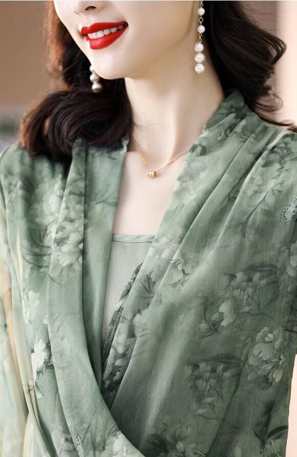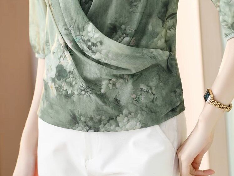 トップス ブラウス 袖あり 5分袖 Vネック カシュクール 襟なし シフォン 透け感 大人可愛い きれいめ カジュアル 大人 上品 おしゃれ お洒落 レトロ 大人女子 こなれ感 ルーズ 個性的 エレガント モダン 主役級 存在感 とろみ感 花柄 春 夏 誕生日 20代 30代 40代 50代 60代 レディース 女性用 ママ OL 通勤 デート お出かけ 女子会 休日 イベント 旅行 レストラン 着回し オルチャン ファッション コーデ スタイル 楽ちん トレンド サイズ豊富 大きいサイズ グリーン