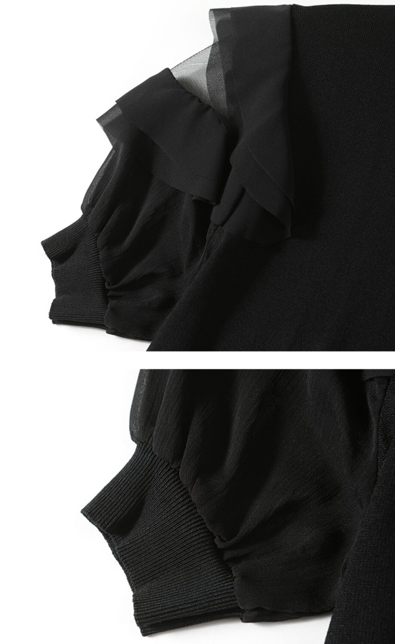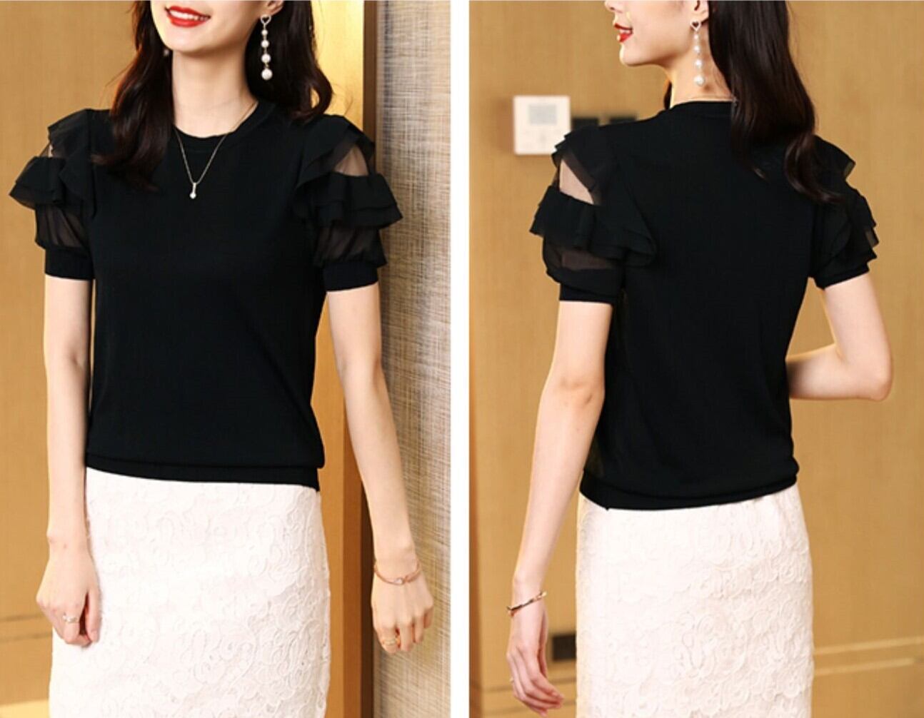 トップス カットソー ニットソー プルオーバー 半袖 クルーネック 襟なし ストレート フリル 切り替えデザイン 透け感 シースルー ニット サマーニット 大人可愛い きれいめ シンプル おしゃれ お洒落 大人女子 ガーリー 主役級 存在感 抜け感 無地 夏 10代 20代 30代 レディース 女性用 デート お出かけ 女子会 休日 リゾート 旅行 着回し 普段使い 韓国系 オルチャン ファッション コーデ スタイル サイズ M L XL 2XL 3XL 4XL 5XL 色展開 黒 ブラック