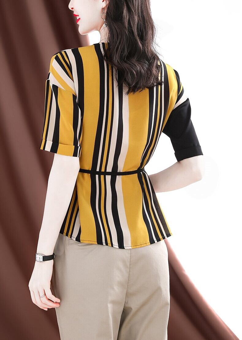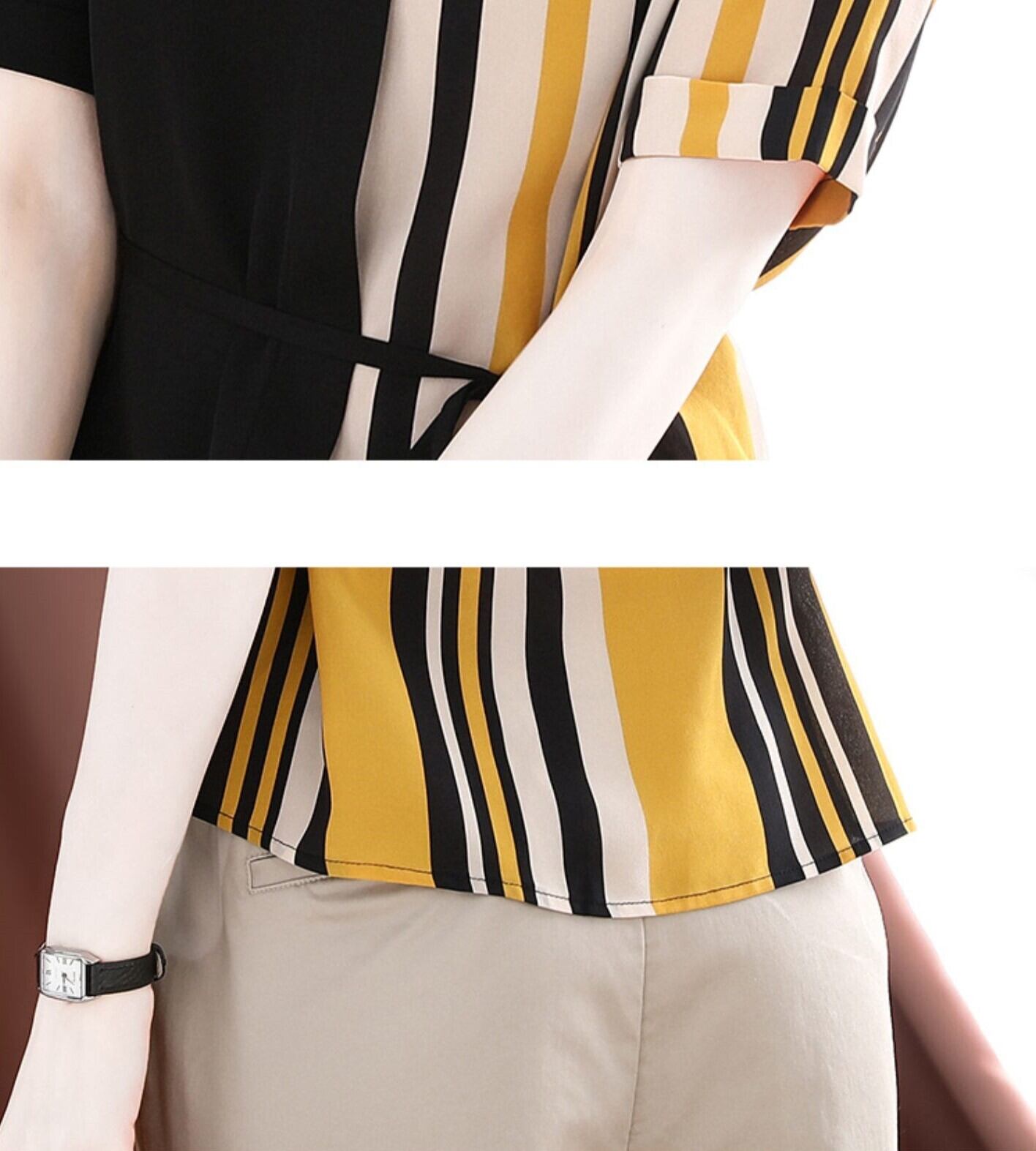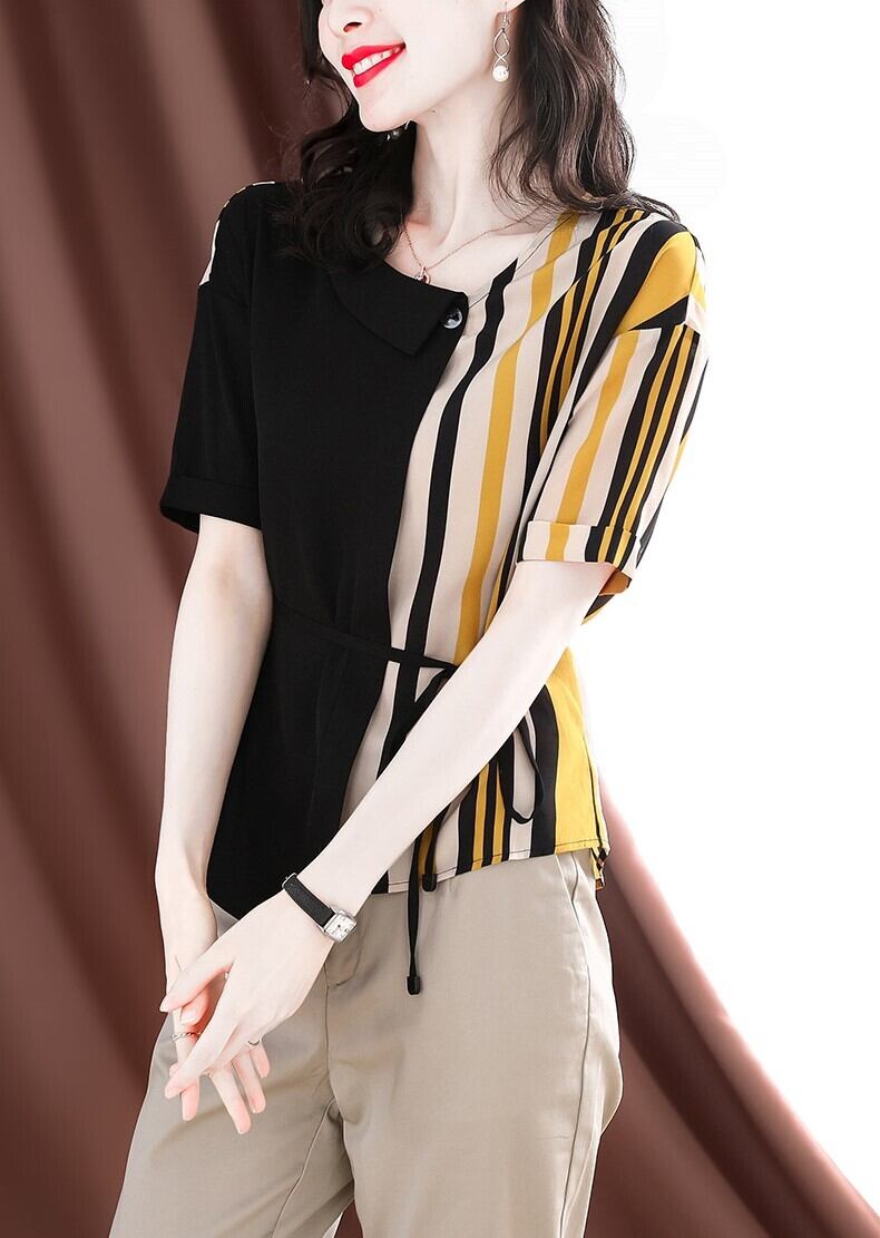 トップス ブラウス プルオーバー 半袖 アシンメトリー レイヤード風 ラウンドネック ストレート ウエストリボン 切り替えデザイン ドッキング 大人可愛い シンプル カジュアル おしゃれ お洒落 大人女子 こなれ感 ラフ 個性的 主役級 存在感 抜け感 無地 ストライプ 夏 20代 30代 40代 50代 60代 レディース 女性用 デート お出かけ 女子会 休日 リゾート 旅行 着回し 普段使い 韓国系 オルチャン ファッション コーデ 体系カバー M L XL 2XL 3XL ブラック イエロー