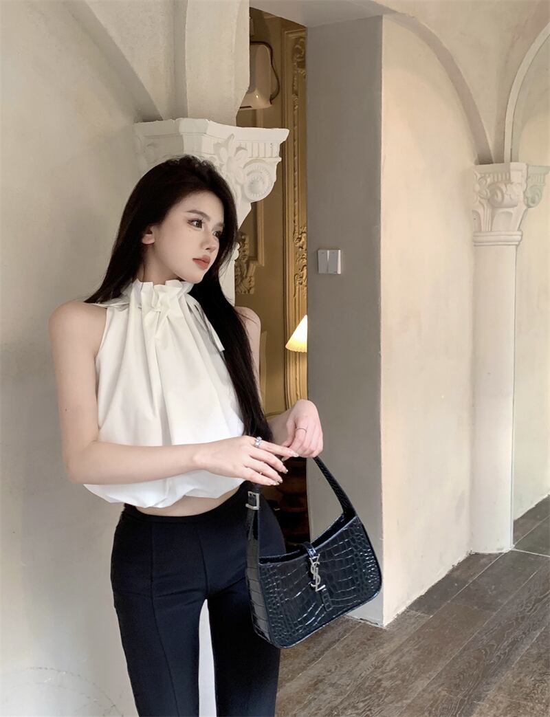 首元をリボンで絞れるデザインが特徴的なノースリーブのトップス。