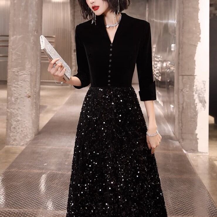 ドレス パーティードレス ロングドレス ミモレ丈ドレス イブニングドレス ミモレ丈 ロング丈 7分袖 Vネック Aライン フレア 切り替えデザイン スパンコール 大人可愛い きれいめ 大人 おしゃれ お洒落 大人女子 キュート 個性的 クール エレガント モダン 主役級 存在感 無地 10代 20代 30代 40代 レディース ママ 女子会 パーティー イベント ホテル レストラン 高見え 格上げ インスタ映え シーズンレス お呼ばれ パーティー 演奏会 ステージ 撮影 キャバ嬢 サイズ豊富 ブラック