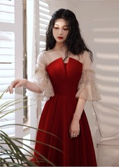 綺麗な紅色のワンピースにメッシュ袖が可愛らしい!