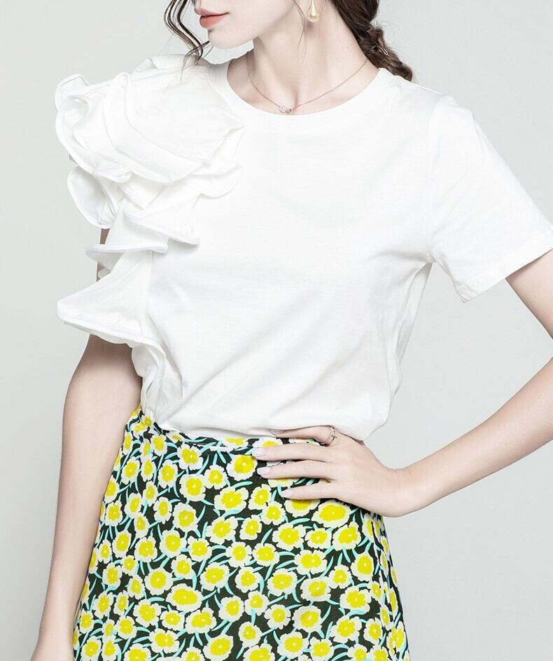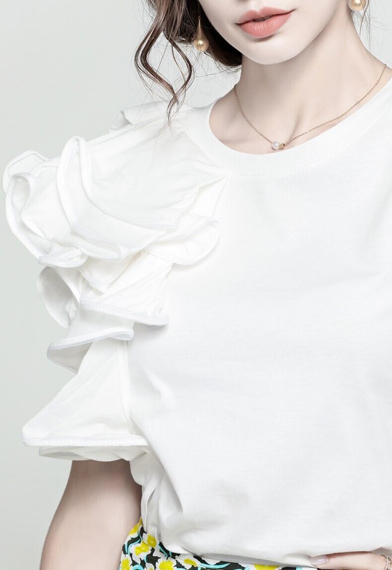 フリルが華やかなアシンメトリー半袖カットソートップス。