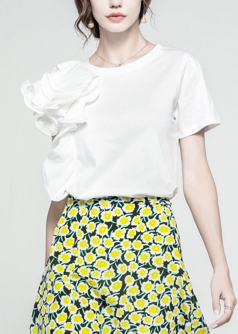 トップス Tシャツ カットソー プルオーバー 白トップス 半袖 クルーネック ストレート アシンメトリー フリル 切り替えデザイン ドッキング 綿 コットン かわいい 大人可愛い シンプル カジュアル おしゃれ お洒落 大人女子 こなれ感 ラフ ガーリー 個性的 主役級 存在感 抜け感 無地 夏 10代 20代 30代 40代 50代 60代 レディース 女性用 デート お出かけ 女子会 休日 イベント リゾート 旅行 海 プール 着回し 普段使い 韓国系 オルチャン ファッション S M L ホワイト