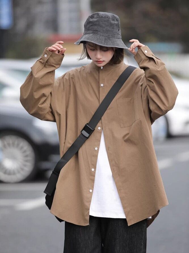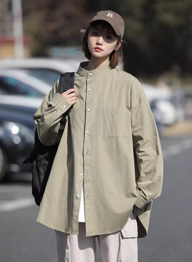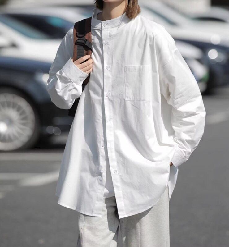スタンドカラーシャツは、大人可愛いさときれいめな印象を与えます。