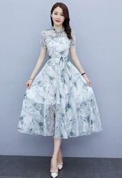 ワンピース フレアワンピース ミモレ丈 ロング丈 半袖 パフスリーブ クルーネック フレア フリル ウエストマーク ウエストリボン ハイウエスト 透け感 シースルー かわいい 大人可愛い きれいめ おしゃれ お洒落 大人女子 こなれ感 ガーリー 主役級 存在感 柄 花柄 フラワー 夏 10代 20代 30代 レディース 女性用 デート お出かけ 女子会 休日 パーティー イベント ホテル レストラン 着回し 普段使い 韓国系 オルチャン ファッション コーデ スタイル 体系カバー 脚長 ブルー パープル