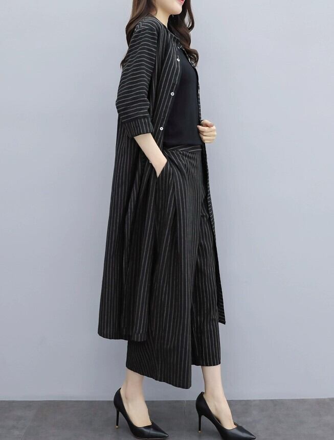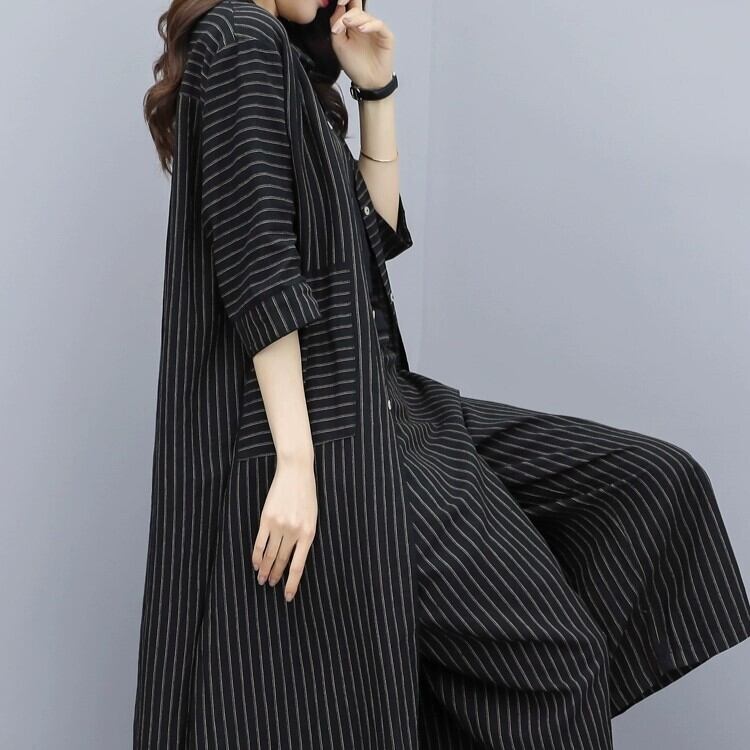 ストライプのロング丈シャツとパンツの2点セットです。