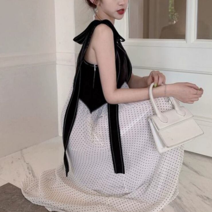 胸元での切り替えデザインがお洒落で、透け感のあるドット柄スカートが涼し気でかわいい1枚です。