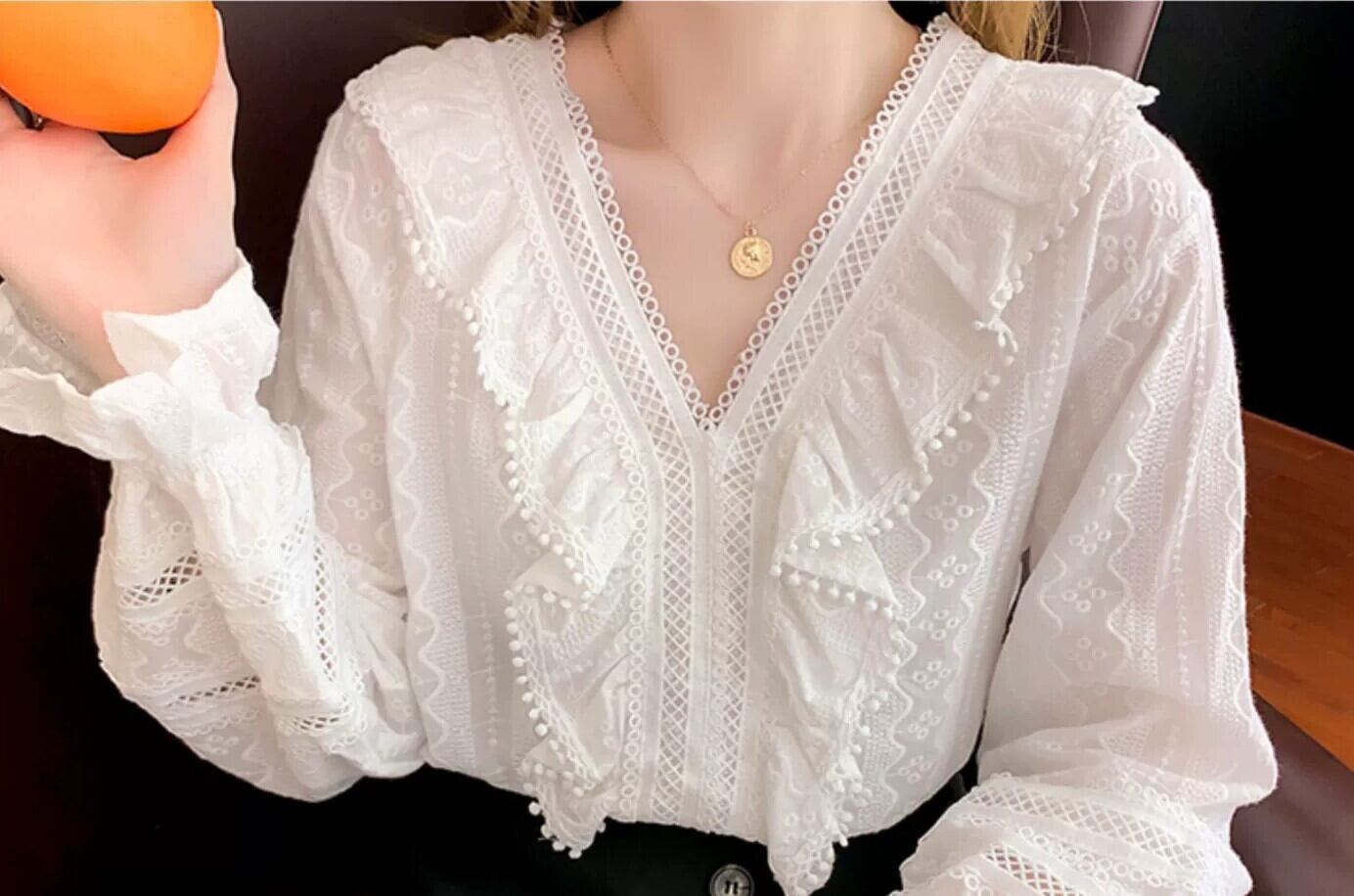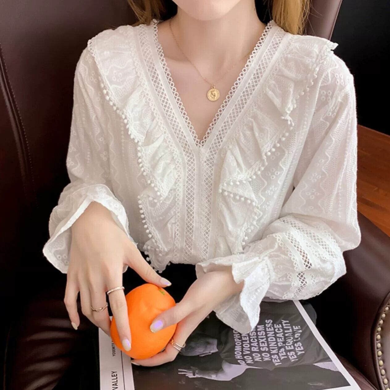 トップス ブラウス 白シャツ 長袖 ボリューム袖 フレアスリーブ Vネック レース フリル 透け感 薄手 かわいい 大人可愛い きれいめ 大人 上品 おしゃれ お洒落 大人可愛い 大人女子 こなれ感 ラブリー キュート ガーリー エレガント 主役級 存在感 とろみ感 抜け感 春 秋 10代 20代 30代 レディース 女性用 ママ OL 通勤 学生 デート お出かけ 女子会 休日 イベント 旅行 ホテル ガーデン レストラン 着回し 普段使い モテ S M L XL ホワイト