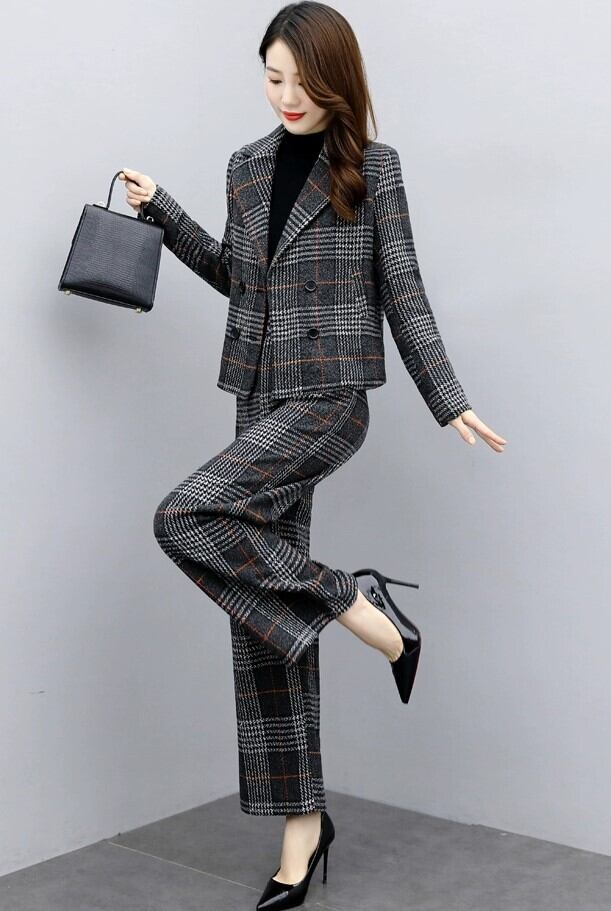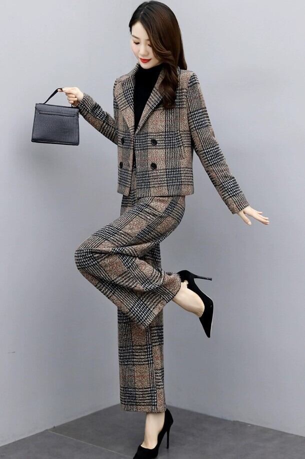シックなチェック柄が上品なジャケットとパンツのセットアップです。