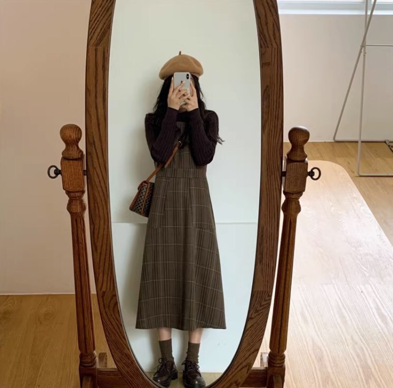 ミモレ丈で女性らしいシルエットを演出し、チェック柄がトレンド感をプラスしています。